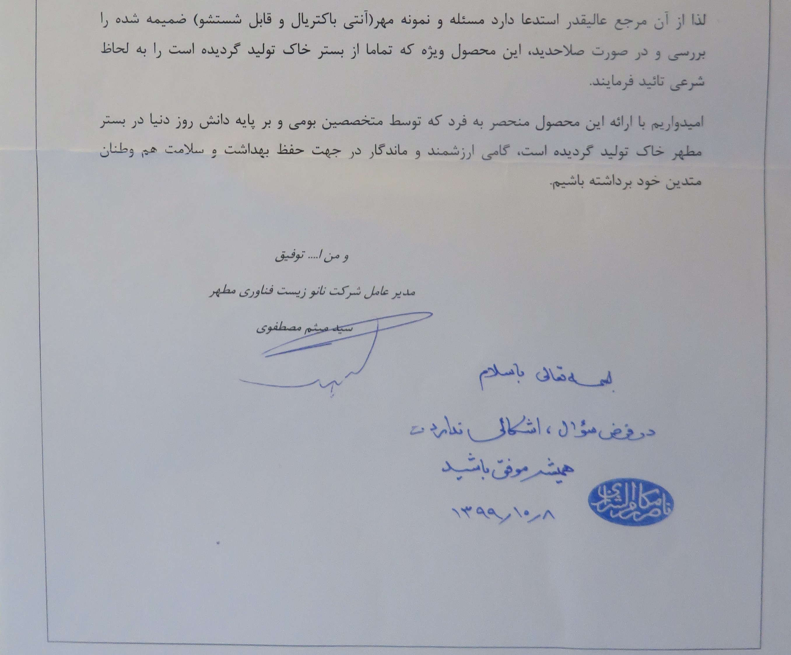 2-فتوای اختصاصی در مورد هر دو محصول مهر نماز آنتی باکتریال معمولی و آنتی باکتریال بصورت مجزا از مرجع عال قدر این الله مکارم شیرازی(بعنوان نمونه)